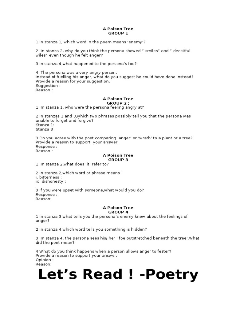 Questions Answers Poison Tree Answers Poems